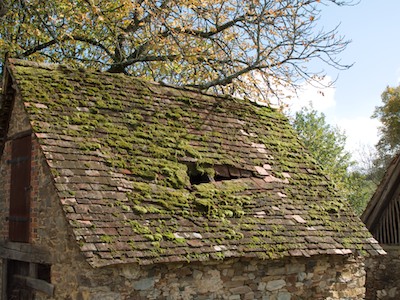 The pleasure of arriving on this trip was slightly reduced when I spotted a hole in the roof of one of the outbuildings. A quick investigation showed that the timber battons had slipped as the nails holding them in place had rusted through.